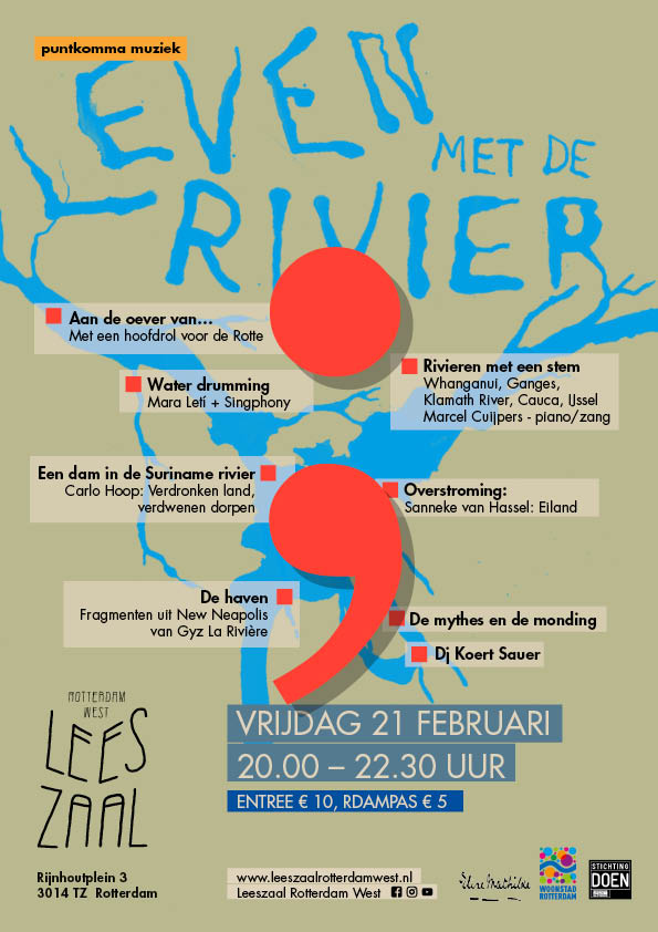 Het PuntKomma Muziekprogramma nam het publiek mee op een muzikale reis door verschillende continenten, met verhalen over het leven langs de rivier. De muziek verweefde emoties zoals harmonie, empathie, angst en agressie. Het wassen in de rivier werd vertaald naar waterdrumming, terwijl het genieten aan de oever stond voor luisteren en het toekennen van rechten. Het ingrijpen van de mens riep een reactie van de rivier op, die de bovenwereld in de onderwereld deed verdwijnen. Ook het verkeer, de haven en het “Heen-en-Weer” van de veerpont speelden een rol.